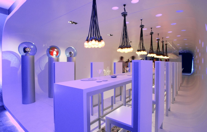 From the furniture to the dishes, everything in this bar was designed following a very abstract and neutral aesthetic.
